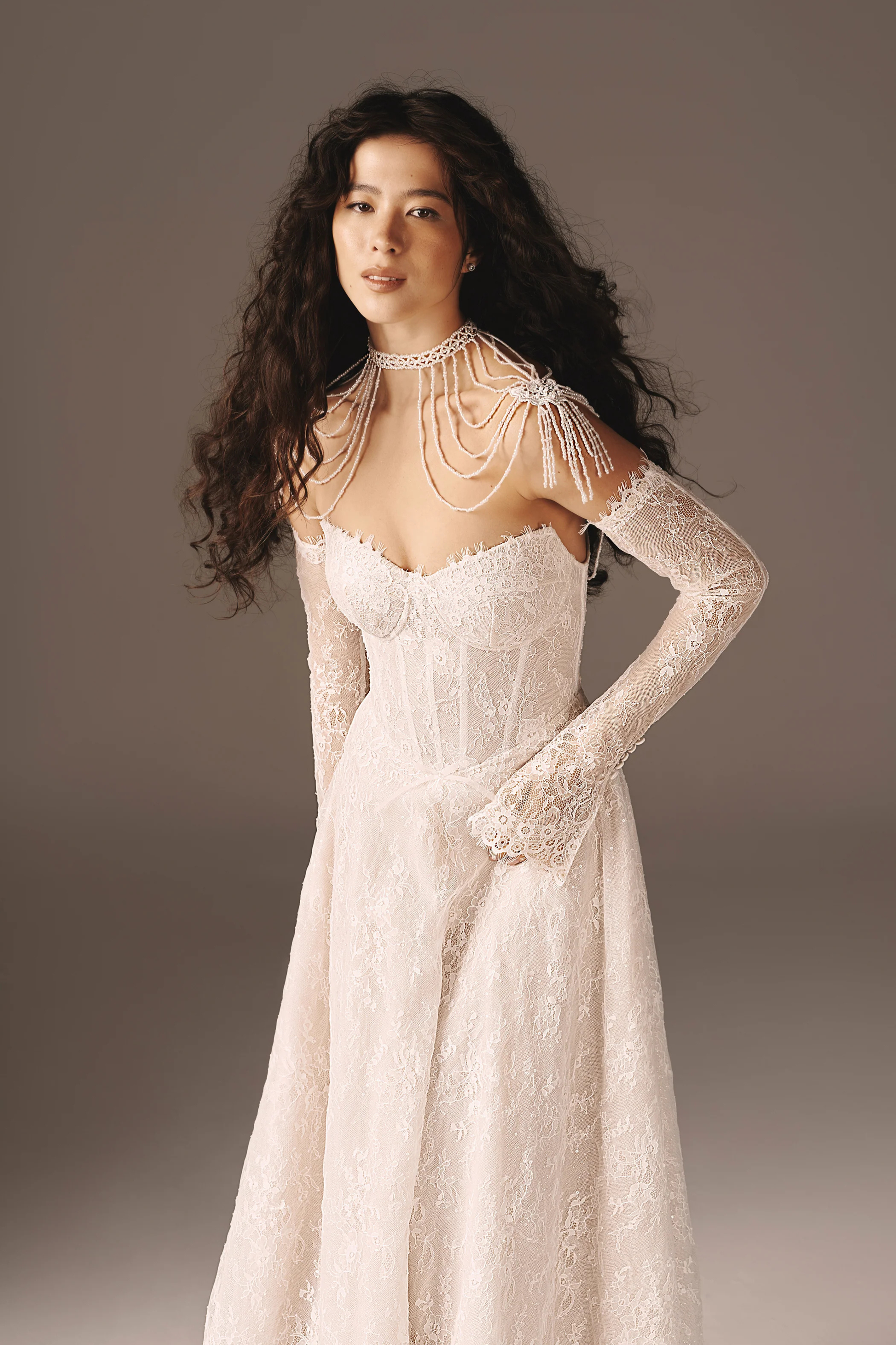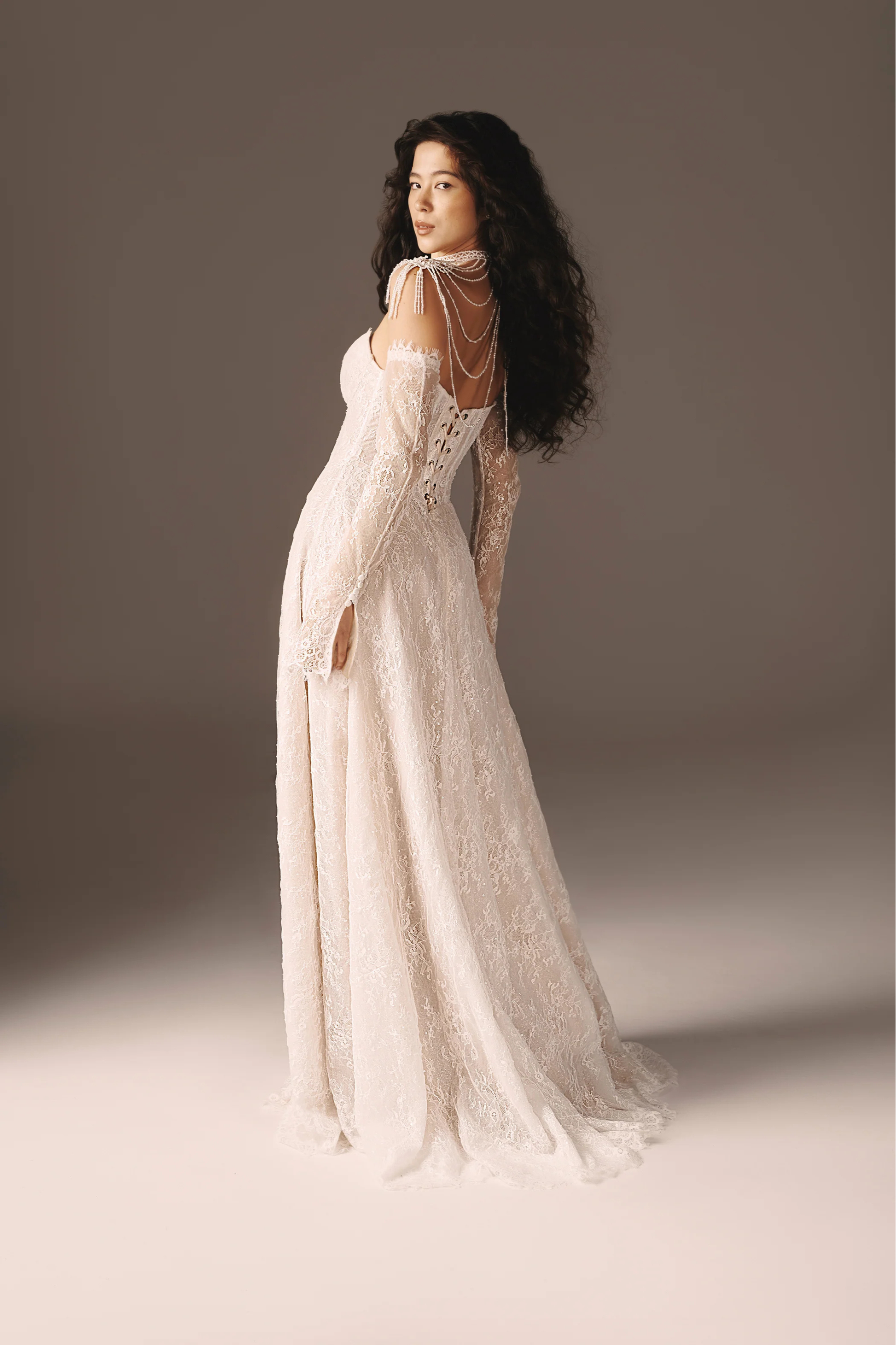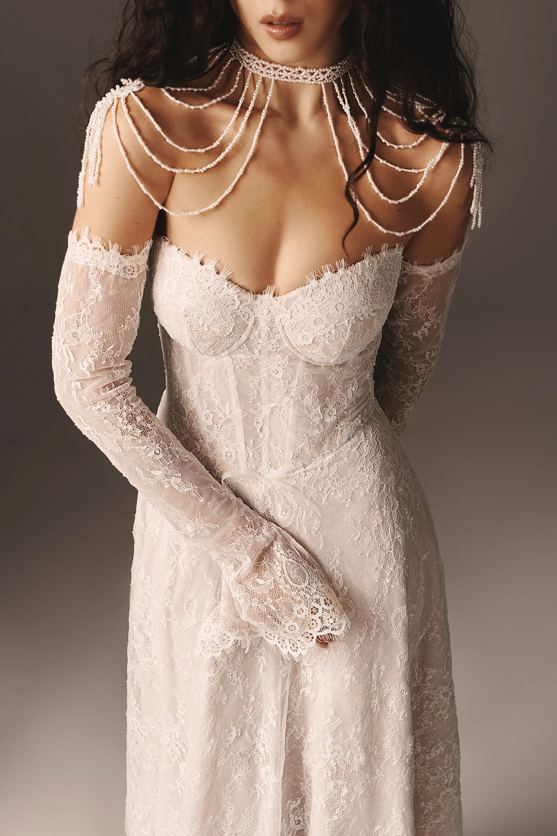 Romantic and luminous, this A-line wedding gown is crafted from delicate French Chantilly lace embroidered with subtle sequins over a soft nude base, creating a graceful shimmering effect. The structured V-neck corset beautifully shapes the silhouette while adding timeless elegance. Long lace gloves and a delicate pearl choker complete the look, giving the gown a refined and modern bridal touch. A perfect blend of classic romance and contemporary sophistication. 🤍